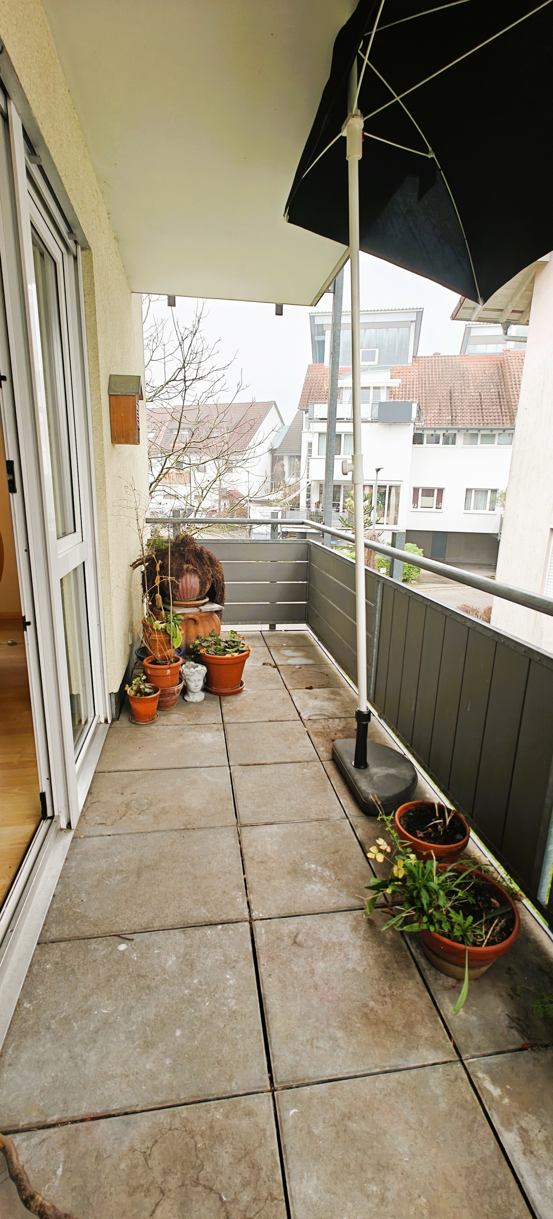 Der überdachte Balkon lädt dazu ein, die frische Luft und die Ruhe der Umgebung zu genießen. Hier können Sie entspannen und die Natur in vollen Zügen erleben.